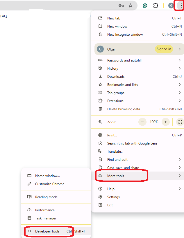 - In your browser, go to the three dots -> More tools -> Developer tools