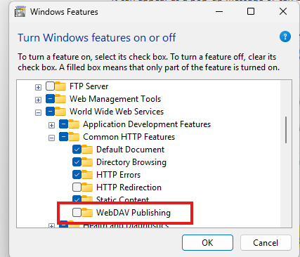 A possible reason for this could be the setting in IIS, called WebDAV Publishing. To fix this, please uncheck the option from Windows Features: